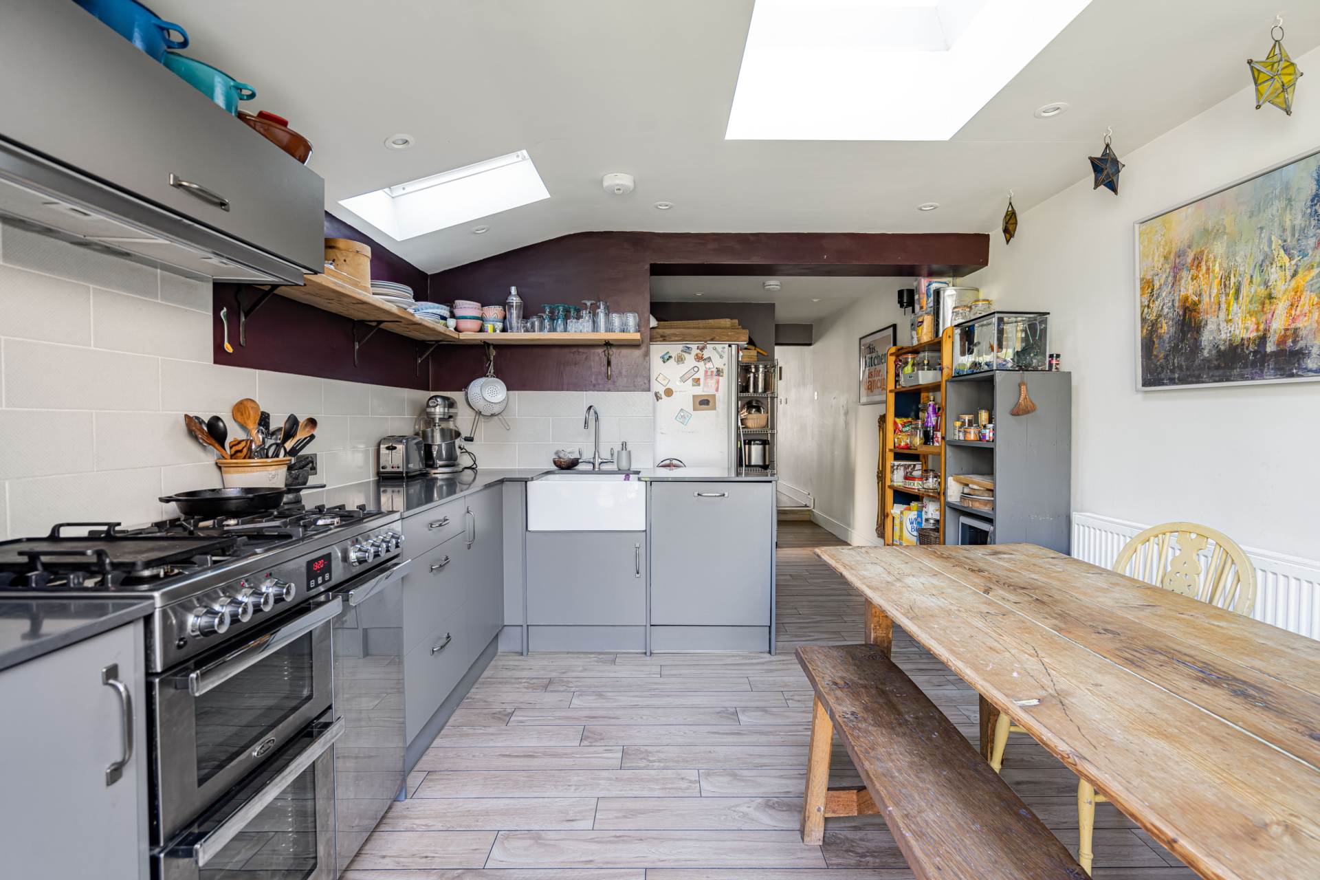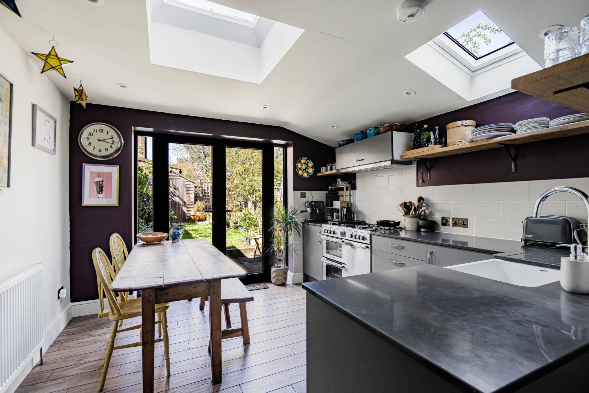 This property features a bright, dual-aspect open-plan living and dining area, enhanced by its original sash windows, along with a convenient ground-floor W/C. The spacious, modern kitchen is well-equipped with ample storage and provides an additional seating area. French doors allow direct access to the enclosed private garden.